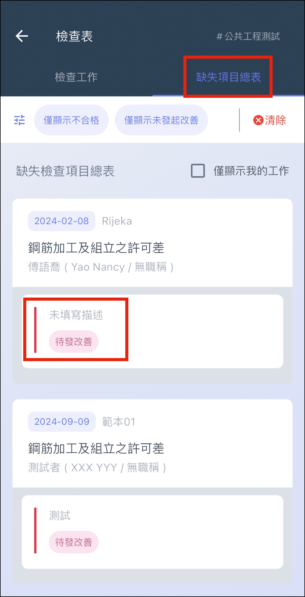 進入檢查表後,選擇 「 缺失項目總表 」 分頁,點選缺失項目的 「 待發改善 」 即可開始填寫改善單類型及發起改善單。若須修改發出的改善單,或改派給其它人,還可以選擇 「 重發改善 」。