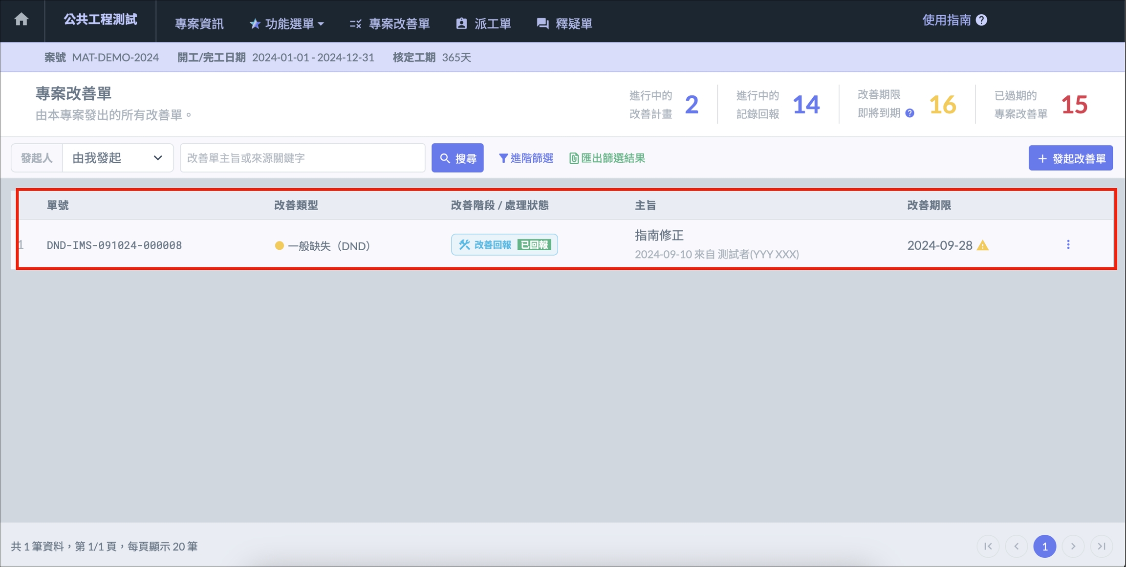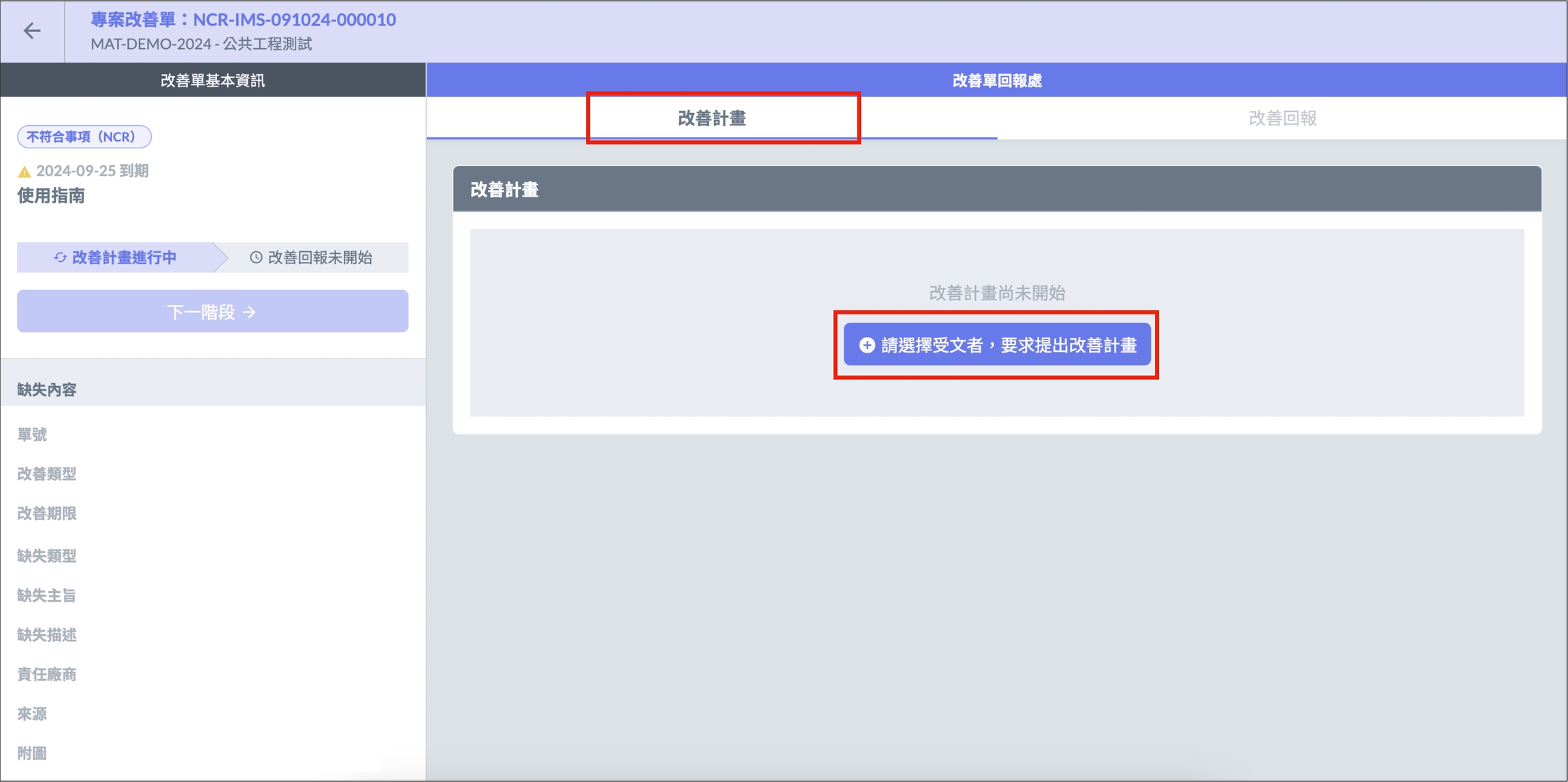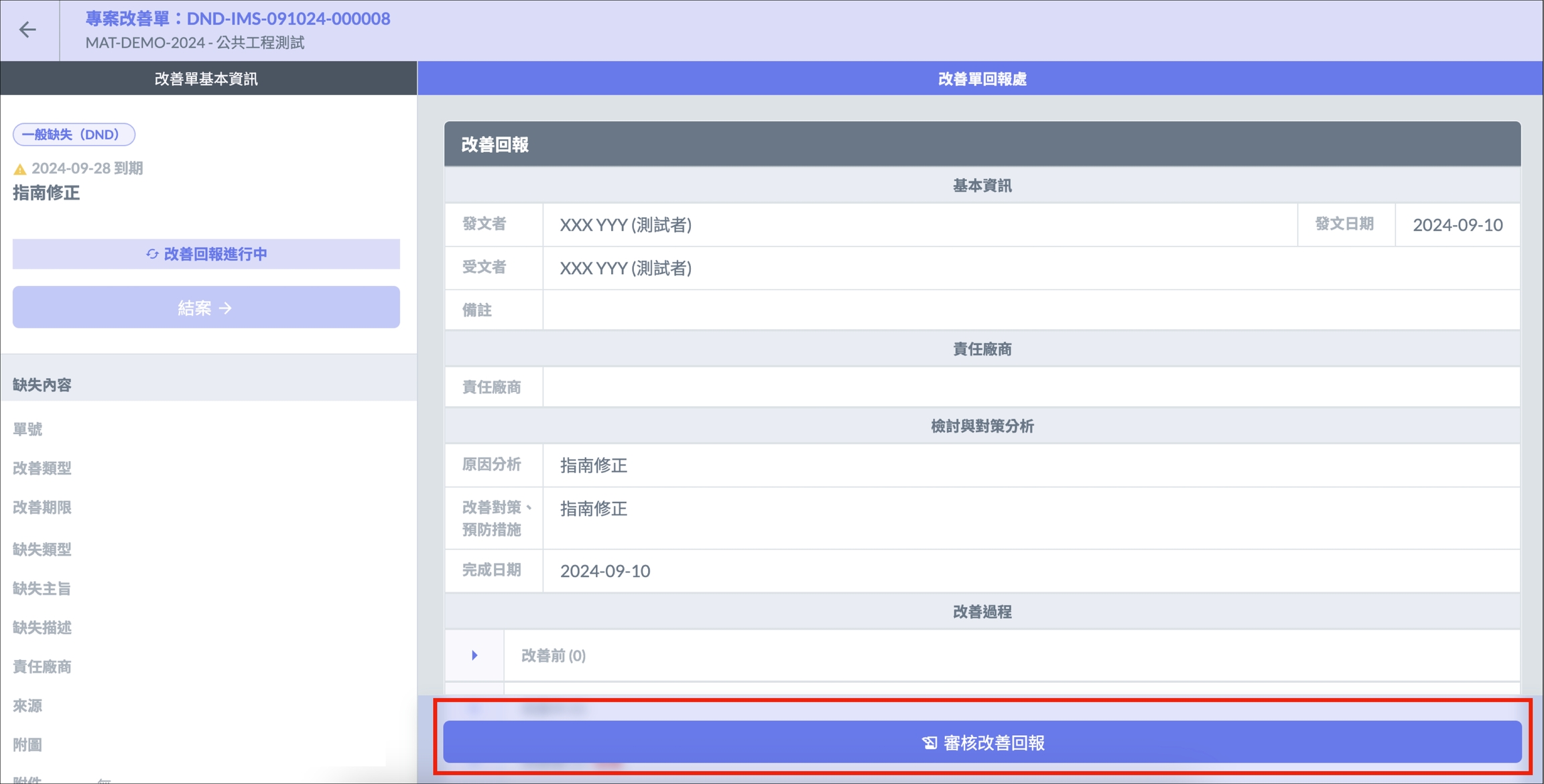進入專案改善單頁面後,找到需審核的改善單。點選改善單即可查看內容,並按下 「 審核改善計畫/審核改善回報 」 進行審核。