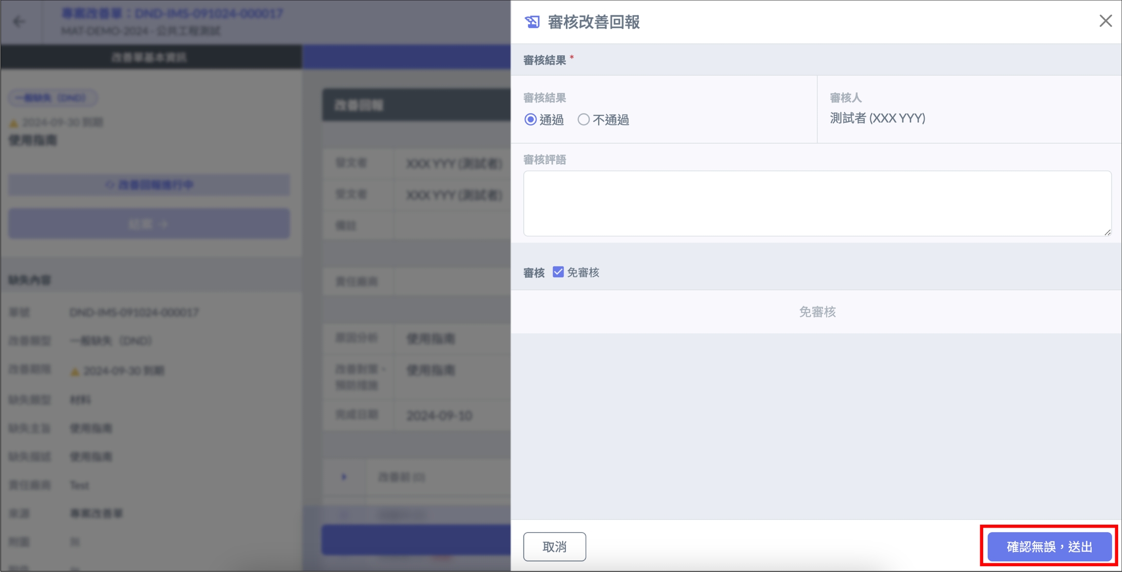 若是改善回報審核通過,可選擇選擇免審核,公司成員進行內部審核,公司內部成員審核完畢後,可按下結案按鈕,讓改善單正式結案。