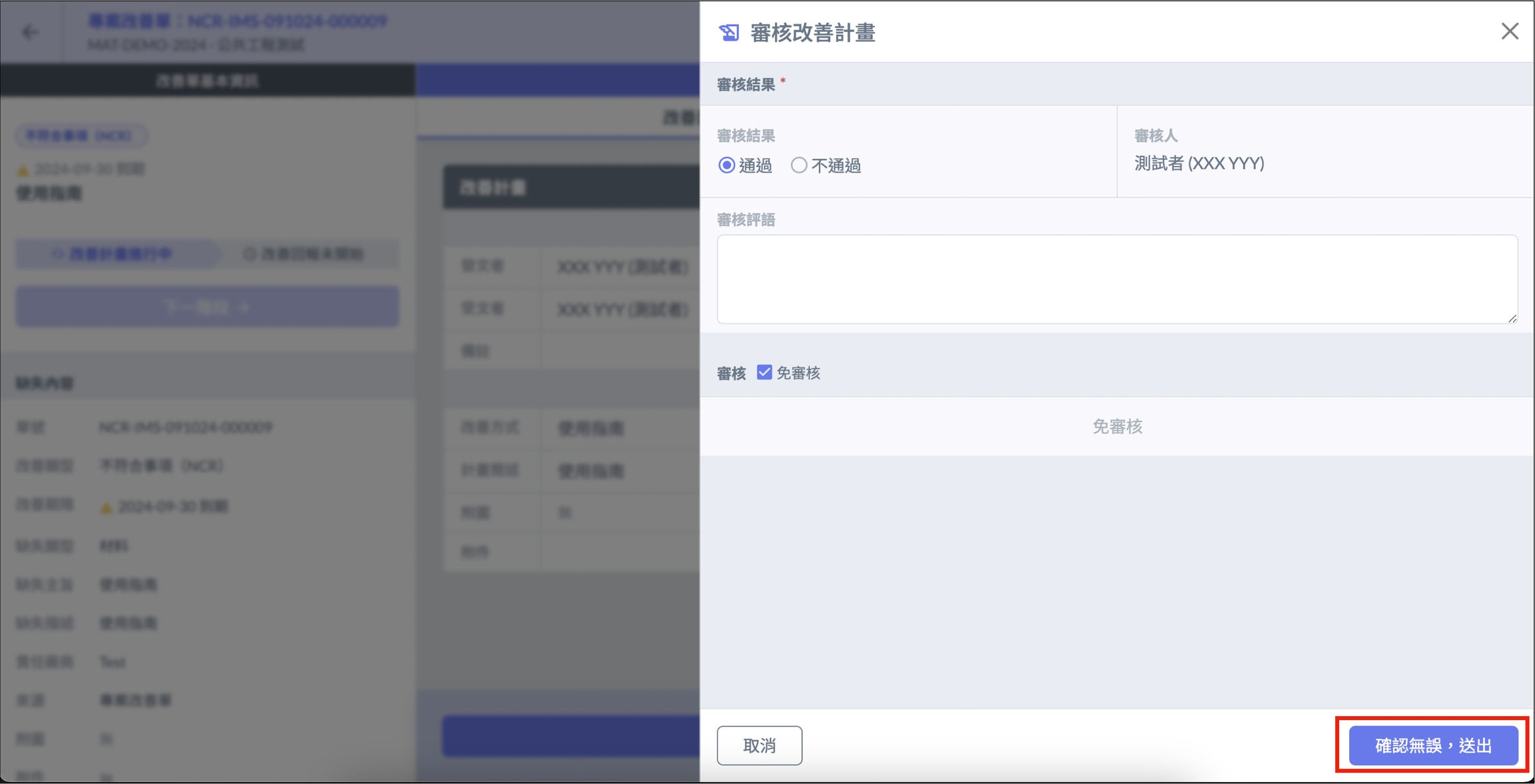 若是改善計畫審核通過,可進一步選擇公司成員進行內部審核,或是選擇免審核。選擇完畢後點擊 「 確認無誤,送出 」 ,即可進入改善回報階段,繼續發送改善回報改善單給受文者。