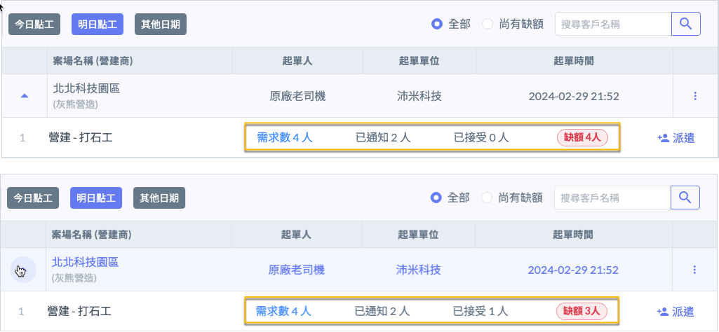 由派遣商接到工地從各種管道告知的人力需求後,幫客戶新增。(包含LINE、電話、email等系統外的方式告知)。