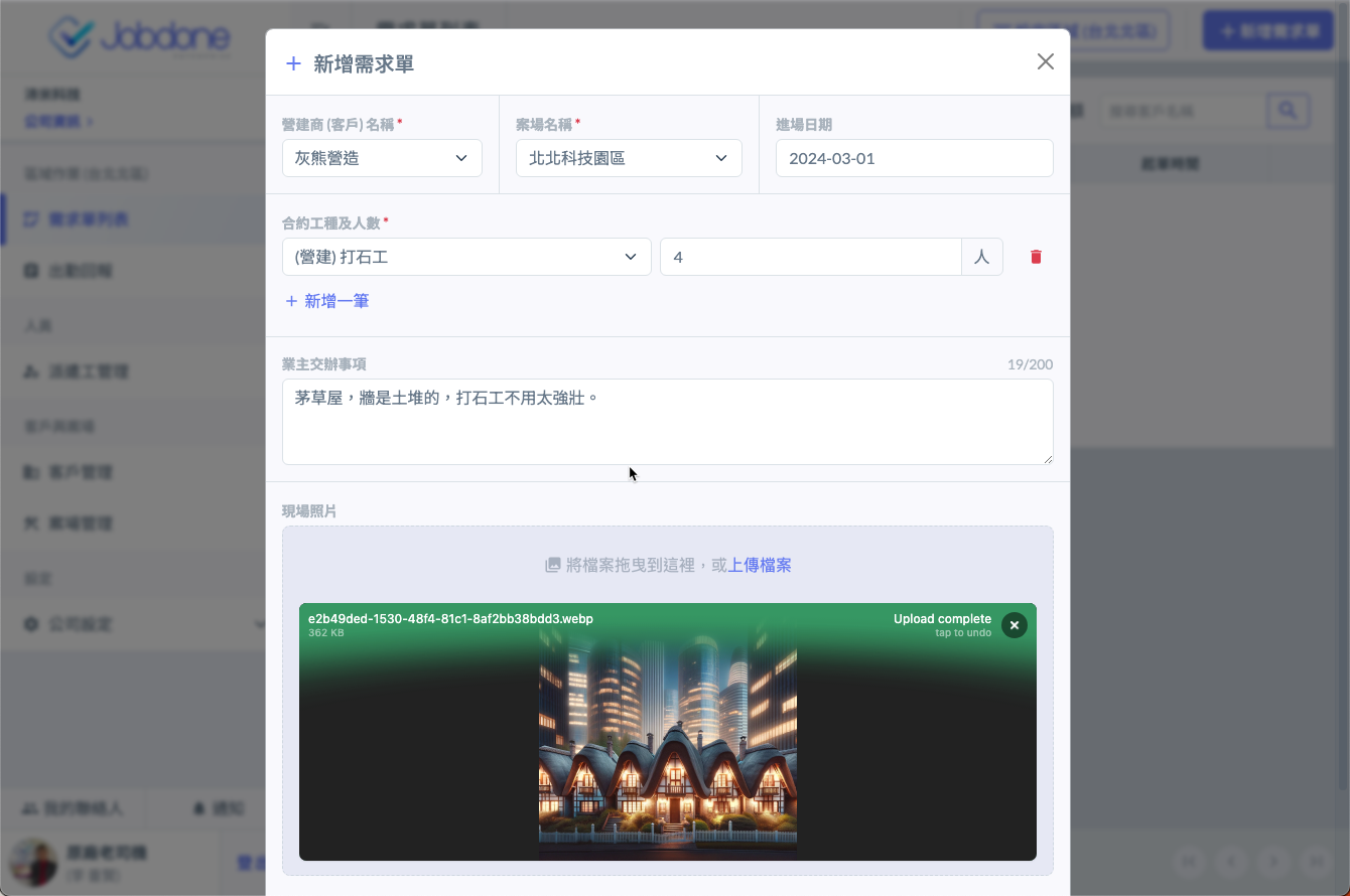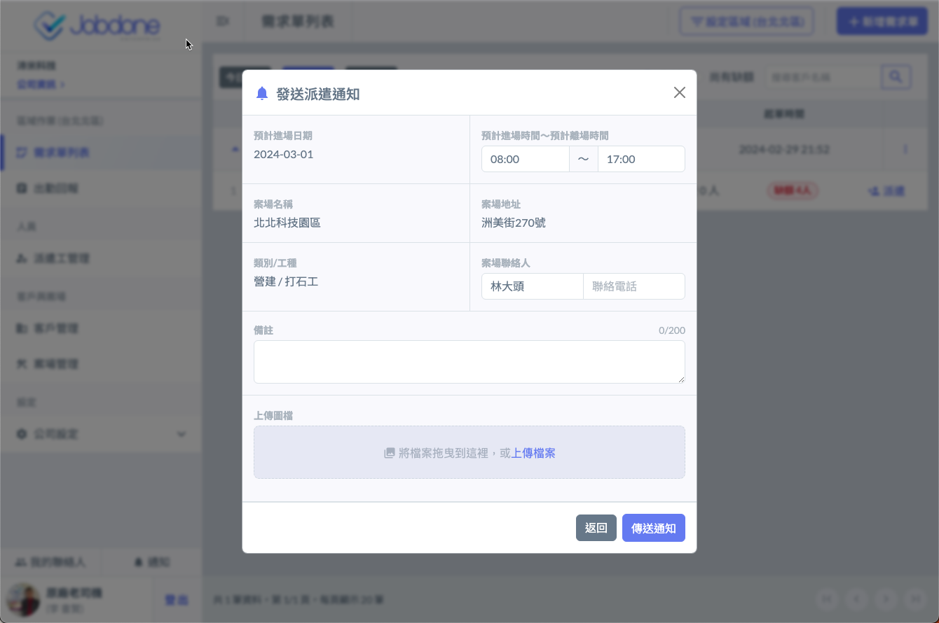 由客戶案場的管理人員使用 【點工】 功能,自行開立 【需求單】 後,系統自動同步至使用Jobdone的派遣商的負責區域下。